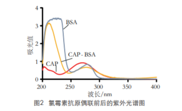 稱取10 mg氯霉素和丁 二酸酐溶于1 mL丙酮,振蕩反應1.5 h。于40 ℃ 氮吹后,加入200 µL DMSO溶解殘留物,再分別 加入200 µL 5 mg/mL EDC和NHS溶液,振蕩反應 2 h。再加入2 mL 5 mg/mL BSA溶液,振蕩反應4 h,4 ℃下用1xPBS透析3 d,然后分裝,—20 ℃冷 凍保存?zhèn)溆谩?/span>