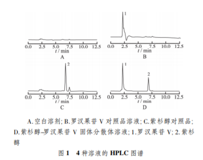 分別取空白溶劑、羅漢果苷 V 對(duì) 照品溶液、紫杉醇對(duì)照品溶液和紫杉醇-羅漢果苷 V 固 體分散體溶液,按“2.3.1”條件,進(jìn)行 HPLC 分析,紫杉 醇典型色譜圖見(jiàn)圖 1。結(jié)果表明,在本色譜條件下,紫 杉醇峰形良好,保留時(shí)間約為 6.8 min,空白溶劑和羅 漢果苷 V 對(duì)主峰的測(cè)定無(wú)干擾。