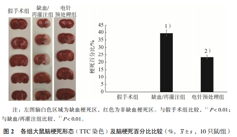 60 只體質(zhì)量 220~240 g 的 SPF 級(jí) 3 月齡雄性 SD 大鼠(三峽大學(xué)實(shí)驗(yàn)動(dòng)物中心,許可證號(hào): SCXK(鄂)2012-0068),按照隨機(jī)數(shù)字表分為假手 術(shù)組、缺血/再灌注組和電針預(yù)處理組,每組 20 只。飼 養(yǎng)于湖北中醫(yī)藥大學(xué)實(shí)驗(yàn)動(dòng)物中心,室溫 20~25 ℃, 光照時(shí)間(7:00-19:00)。本實(shí)驗(yàn)過(guò)程中對(duì)動(dòng)物的 處置嚴(yán)格按照科技部398 號(hào)《關(guān)于善待實(shí)驗(yàn) 動(dòng)物的指導(dǎo)性意見(jiàn)》文件要求進(jìn)行。