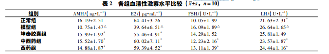 給予雷公藤多苷片的 55 只大鼠呈現(xiàn)不同 程度的動情周期紊亂,表現(xiàn)為延長與停滯。連續(xù)灌胃 2 周 后,46 只大鼠出現(xiàn)連續(xù)動情周期紊亂,造 模 成 功 率 為 83. 6%; 2 周治療結(jié)束后,陰道脫落細胞涂片顯示 28 只大 鼠動情周期恢復 ( 28 /46,60. 9%) ,其中模型組 3 只 ( 3 / 11,27. 3%) ,西藥組 8 只 ( 8 /11,72. 7%) ,坤泰膠囊組 8 只 ( 8 /12,66. 7%) ,中西藥組 9 只 ( 9 /12,75%) 。與正常組比較,模型組 血清 AMH、E2 水 平 顯 著 降 低,LH、FSH 水 平 顯 著 升 高 ( P<0. 05) ; 與模型組比較,坤泰膠囊組、中西藥組、西藥 組 AMH、E2 水平顯著升高 ( P<0. 05) ,中西藥組、西藥組 FSH、LH 水平顯著降低 ( P<0. 05) 。