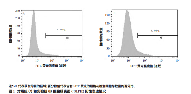取對數(shù)生長期的 SNU-423 細(xì)胞, 均勻接種于 6 孔板,待細(xì)胞長至 80% ~ 90%時,消化 收集細(xì)胞,移入 5 mL 的無菌離心管中,335 × g 離心 5 min;用 2 mL PBS 洗滌 2 次,調(diào)整離心管中細(xì)胞的 濃度為 1 × 106 個 / mL。將細(xì)胞分為對照組及實驗 組,對照組為 Goat Anti-Rabbit IgG HL 孵育過的細(xì) 胞;實驗組為經(jīng) Anti-GOLPH2 抗體標(biāo)記 Goat AntiRabbit IgG HL 孵育過的細(xì)胞。
