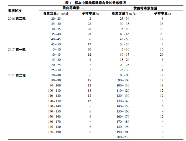 樣品中黃曲霉毒素 B1 及其總量的含量與樣 品的取樣范圍有關(guān),考核中 2 g 為 1 份子樣品,表1 為比對考核中樣本中黃曲霉毒素含量的分布 情況。