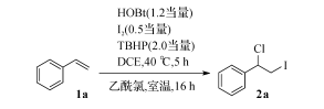首先筆者采用苯乙烯1a的1-氯-2-碘代反應(yīng)為 模板反應(yīng),對(duì)反應(yīng)條件進(jìn)行優(yōu)化。苯乙烯與1.2當(dāng) 量1-羥基苯并三氮唑、0.5當(dāng)量碘單質(zhì),以2當(dāng)量質(zhì) 量分?jǐn)?shù)為70%的 TBHP為氧化劑,在二氯乙烷溶劑 中40 ℃下反應(yīng)5h,隨后與5當(dāng)量乙酰氯進(jìn)一步室 溫反應(yīng)16h,能以45%的收率得到目標(biāo)產(chǎn)物2a。苯 乙烯1a的1-氯-2-碘代反應(yīng)過(guò)程為在此基礎(chǔ)上篩選氧化劑、溶劑和氯化 試 劑。氧 化劑對(duì)反應(yīng)收率的影響如表1中 序 號(hào)1~5所 示。 在沒(méi)有氧化劑的情況下,烯烴的1-氯-2-碘代反應(yīng)不 能進(jìn)行。對(duì)常見(jiàn)的氧化劑進(jìn)行篩選,發(fā)現(xiàn)過(guò)硫酸鉀 和二叔丁基過(guò)氧化物對(duì)反應(yīng)沒(méi)有作用,雙氧水作氧 化劑目 標(biāo) 產(chǎn) 物 的 收 率 達(dá) 到 29%。因 此,最 終 選 擇 TBHP水溶 液 作 氧 化 劑。
