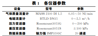 分別采用氣體質(zhì)量流量計(jì)和電磁流量計(jì)測量氣 路和水路的流量,采用羅斯蒙特壓力變送器測量氣 液路的壓力,實(shí)驗(yàn)段差壓由羅斯蒙特差壓變送器測 量.氣體質(zhì)量流量計(jì)、電磁流量計(jì)、壓力變送器和差 壓變送器由24VDC供電,輸出4~20mA電流并在 回路中串聯(lián)250Ω電阻,從回路取出的1~5V電壓 信號(hào)由與電腦相 連 的20通道IMP 采集 板 實(shí) 時(shí) 采 集,各儀器參數(shù)如表1所示.