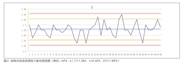先將SA-7000血流變儀進(jìn)行日常的維護(hù)、清洗和保養(yǎng), 對(duì)血漿黏度做定標(biāo)校準(zhǔn),取上述兩份分別編號(hào)為質(zhì)控1和質(zhì) 控2的自制冷凍新鮮血漿各5mL,二者各重復(fù)測(cè)定20次,經(jīng) 過統(tǒng)計(jì)學(xué)處理,分別計(jì)算出它們的均值x及標(biāo)準(zhǔn)差s,作為 各自的靶值及靶值范圍。隨后每天取自制冷凍血漿質(zhì)控1和 質(zhì)控2各一支,置于37?C水浴箱中溫浴約15min,使其復(fù)溶 后立即取出。然后二者與當(dāng)天常規(guī)標(biāo)本一同檢測(cè)得出結(jié)果并 記錄。自制室內(nèi)質(zhì)控連續(xù)開展45個(gè)工作日并同時(shí)繪制質(zhì)控 圖表,觀察分析結(jié)果。