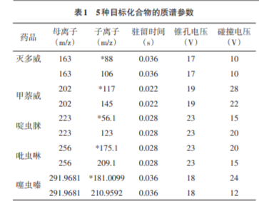 滅多威(Methomyl)、甲萘威(Carbaryl)、啶 蟲(chóng)脒(Acetamiprid)、吡蟲(chóng)啉(Imidacloprid)、噻蟲(chóng)嗪(Thia? methoxam)。以上農(nóng)藥標(biāo)準(zhǔn)品純度均大于98%,購(gòu)于北京 和力順科技有限公司;乙腈(色譜純),美國(guó)TEDIA;乙酸 (AR),國(guó)藥集團(tuán);無(wú)水硫酸鎂、C18粉末、PSA粉末,農(nóng)殘 級(jí),天津博納艾杰爾科技有限公司;實(shí)驗(yàn)所用純水為艾科 浦超純水系統(tǒng)所制。