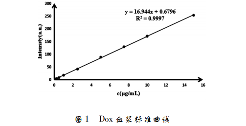 精密稱取 Dox·HCl 1. 25 mg 加水定容到 25 ml 的容量瓶中,配制 50 μg /ml 的 Dox 溶液作為儲(chǔ)備 液。精密吸取儲(chǔ)備液( 0. 04 ml、0. 10 ml、0. 20 ml、 0. 40 ml、1. 00 ml、2. 00 ml、4. 00 ml、6. 00 ml) 放入10 ml 容量瓶中加水定容,配制相應(yīng)濃度( 0. 2 μg /ml、 0. 5 μg /ml、1、2 μg /ml、5 μg /ml、10 μg /ml、20 μg / ml、30 μg /ml) 的 Dox 溶液,4 ℃避光保存待用。