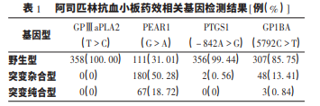 358 例患者中,GPⅢaPLA2( T > C) 基因均為野生 型,無(wú)突變; PEAR1( G > A) 基因野生( GG) 型 111 例,突 變雜合( GA) 型 180 例,突變純合( AA) 型 67 例,突變率 68. 99% ; PTGS1( - 842A > G) 基因野生( AA) 型 356 例, 突變雜合( AG) 型 2 例,突變率 0. 56% ; GP1BA( 5792C >T) 基因野生( CC) 型 307 例,突變雜合( CT) 型 48 例,突變 純合( TT) 型 3 例,突變率 14. 25% 。詳見(jiàn)表 1。