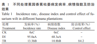 由表1可知,CK處理香蕉植株無(wú)發(fā)病現(xiàn)象;DI處 理在接種香蕉枯萎病菌GFP-FOC4后蕉園的發(fā)病率 高達(dá)95.0%,病情指數(shù)為68.3;TR處理接種生防菌 XP1后蕉園的發(fā)病率為13.3%,與DI處理相比差異達(dá)極顯著水平(P<0.01,下同),病情指數(shù)降低至10.8, 防治效果顯著,達(dá)84.2%。TR處理香蕉枯萎病發(fā)病 率較DI處理降低81.7%(絕對(duì)值),說(shuō)明生防菌對(duì)香蕉枯萎病菌具有較強(qiáng)的拮抗作用。