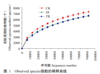 共測(cè)序獲得886890個(gè)序列,在97%的相似水平 下聚類后獲得61660個(gè)OTUs。測(cè)序結(jié)果顯示,3個(gè)樣品的所有優(yōu)質(zhì)序列經(jīng)聚類注釋后歸屬于40個(gè)菌門(mén)。 從圖1可看出,當(dāng)測(cè)序深度達(dá)80000個(gè)序列時(shí),各處理 的Observed species指數(shù)曲線趨向平緩,上升速度減 緩,說(shuō)明測(cè)序深度已基本覆蓋樣品中絕大部分物種; 在同等測(cè)序深度上,無(wú)發(fā)病現(xiàn)象的CK處理實(shí)際觀測(cè) 到的物種數(shù)最多,當(dāng)測(cè)序深度達(dá)70000個(gè)序列時(shí),接 種致病菌的DI處理實(shí)際觀察到的物種數(shù)低于CK處 理、高于TR處理,隨測(cè)序深度的加大,接種生防菌的 TR處理其實(shí)際觀測(cè)到的物種數(shù)略高于DI處理、低于 CK處理。