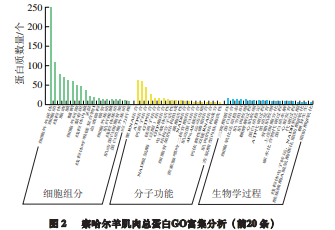 以UniProt/Swiss-Prot蛋白數據庫為背景,對總蛋白 進行鑒定,初步建立察哈爾羊蛋白質表達譜。由圖1可 知,1%假陽性條件下,背最長肌和臀肌中共檢測到蛋白 質1 073 個,其中背最長肌中共檢測到877 個,臀肌中共 檢測到897 個,2 個部位的總蛋白數量相近。對察哈爾羊肌肉總蛋白進行GO組分富集分析,由 圖2可知:在細胞組分中,富集于細胞外外泌體中的蛋白 質數量最多,其次富集于細胞質內的蛋白質數量較多; 在分子功能中,蛋白質主要參與聚RNA結合、ATP結合 和鈣離子結合等功能;在生物學過程中,蛋白質主要參 與三羧酸循環(huán)、蛋白質結合和細胞氧化還原穩(wěn)態(tài)等生物 學過程。